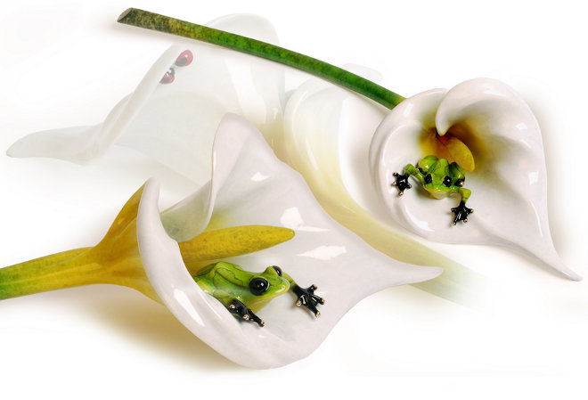 Description: The 2010 Frogman Annual Flower Sculpture. Each year Tim Cotterill creates just one sculpture with a flower and we absolutely love this most beautiful Calla Lily. Lying on its side with an adorable frog peeking out from the flower itself, this is a truly stunning sculpture. Color: while flower, green stem, yellow details, green and yellow frog.