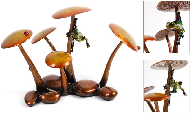 Description: This beautiful and scenic sculpture has a vibrant small frog hiding among the mushrooms. This creation from Tim Cottrell combines whimsy with elegance. The sculpture has ladybugs hiding among the mushroom forest. Green frog with gold mushrooms.