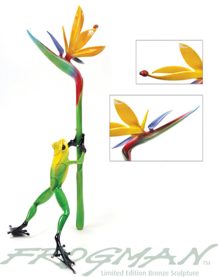 Description: The inspiration for this sculpture comes from the Frogman, Tim Cotterill's own tropical oasis which he calls Paradise. This beautiful piece features a multicoloured bird of paradise flower which is held stunningly by the elegant long-legged frog.