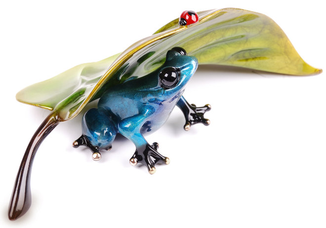 Description: New for Spring 2010 is the most gorgeous small sculpture from Tim Cotterill, The Frogman. A small fun frog peeking out from under a lustrous leaf will make a beautiful addition to your Collection. The colours are Blue Pearl Essence Frog, Green and Gold Leaf